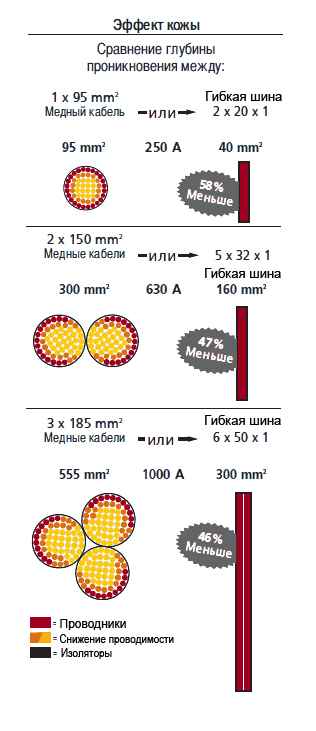 Меньшее сечение на одну и ту же силу тока и меньше места для установки по сравнению с кабелем, освобождается до 20% объема энергоустановки